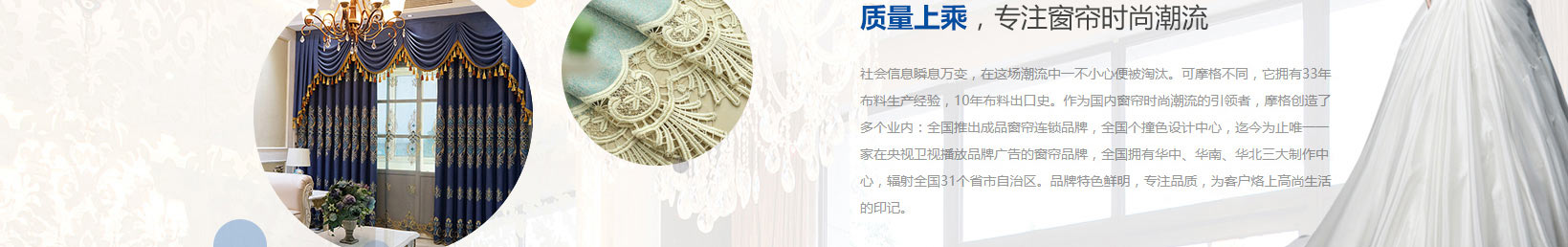 取源于中華悠久紡織文化的摩格(MOONGOOL)品牌,始終堅(jiān)持“健康、時尚、精致”的產(chǎn)品觀,引領(lǐng)軟裝布藝行業(yè)進(jìn)入高品質(zhì)生活。產(chǎn)品設(shè)計風(fēng)格融入歐式低調(diào)奢華元素及國際流行時尚趨勢,先后開發(fā)了古典巴洛克、簡約洛可可、經(jīng)典中式(新中式)、時尚地中海、浪漫田園、唯美美式、原木風(fēng)、奶油風(fēng)、現(xiàn)代簡約風(fēng)九大風(fēng)格系列產(chǎn)品,擁有各種花型、工藝、材料面料達(dá)1500余種。其中窗簾產(chǎn)品作為摩格核心產(chǎn)品頗受消費(fèi)者青睞。采用高精密、棉麻、雪尼爾等上千種布料的摩格窗簾用高端的新興工藝制作,絨面柔軟,織物華麗,九大截然不同的風(fēng)格同時搭配種類繁多的布類花型和不同的制造工藝,顏色或艷麗或素雅或大氣,簡約而不簡單。無論哪一款窗簾,都在注解不一樣的故事,也詮釋著自己的絕佳格調(diào)。正因?yàn)槿绱耍瑐€性獨(dú)特和創(chuàng)新思維賦予摩格更多的市場商機(jī)。